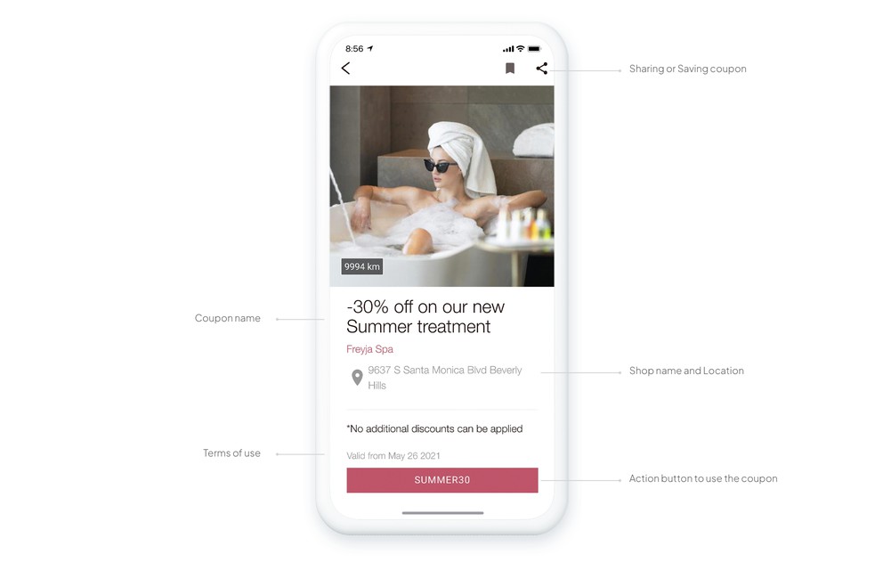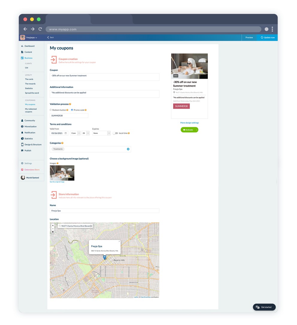 Customize the look, function and content of your coupons: offers, validation process (by activation in the app or using a promo code), validity dates, number of coupons available, number of authorized uses per customer, store information, background image, font, and much more! For each coupon, you can add a location, useful for managing shops.
