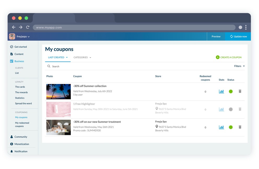 Access all your coupons, organize them by category and track their performance: number of redeemed coupons, status of the coupon, usage broken down by time frames, list of users having redeemed the coupon... You have all the options at hand to make the most of your discount coupons.