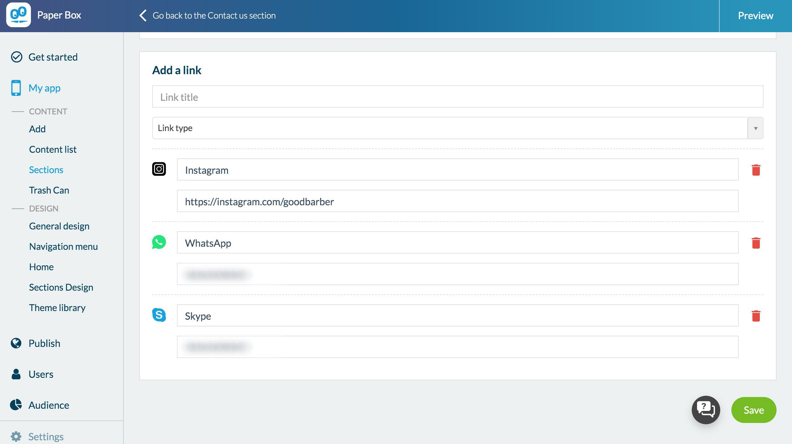 To set them up, go to Content> Sections> Contact> Edit content. Choose the type of link you want to add from the drop-down menu and enter the requested information.