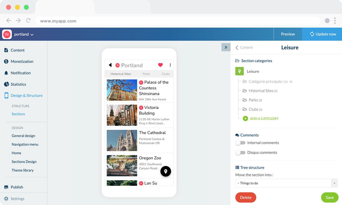 Before you start adding POIs (Points of Interest), it is interesting to create categories within this section (such as Historical Sites, Parks, …), making it easier for the users to navigate inside the app and also to avoid creating an excessive amount of sections.