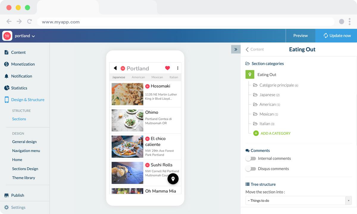 The creation of categories may be performed in different sections (articles, videos...) and is a very effective tool to make the app lighter.