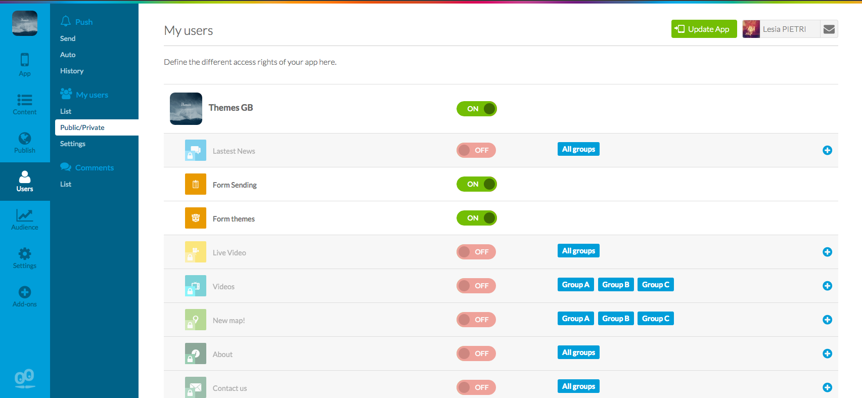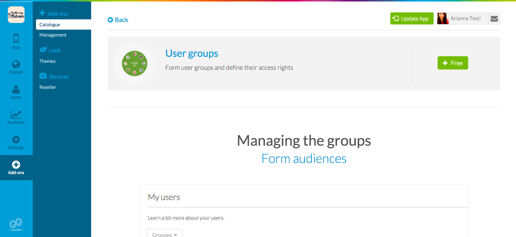 The "User Group" add-on give an extra power to the In-App User Authentication feature. Now it's indeed possible to restrict each sections of your app to just one or more specific groups of users.
