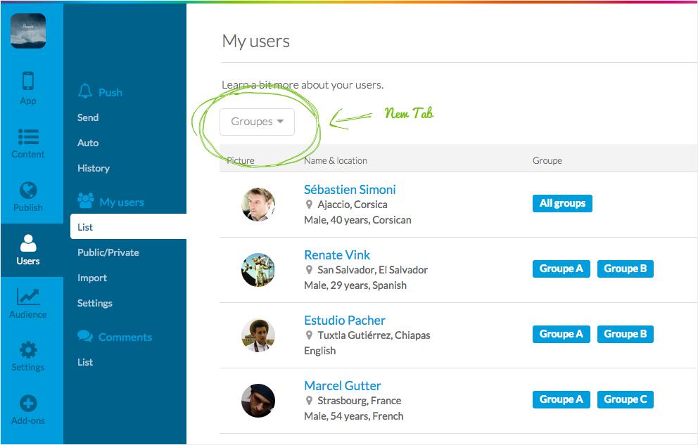 Once activated, GoodBarber will automatically redirect you to the My User > List menu where a green tab will show you where you can add a new group of users.