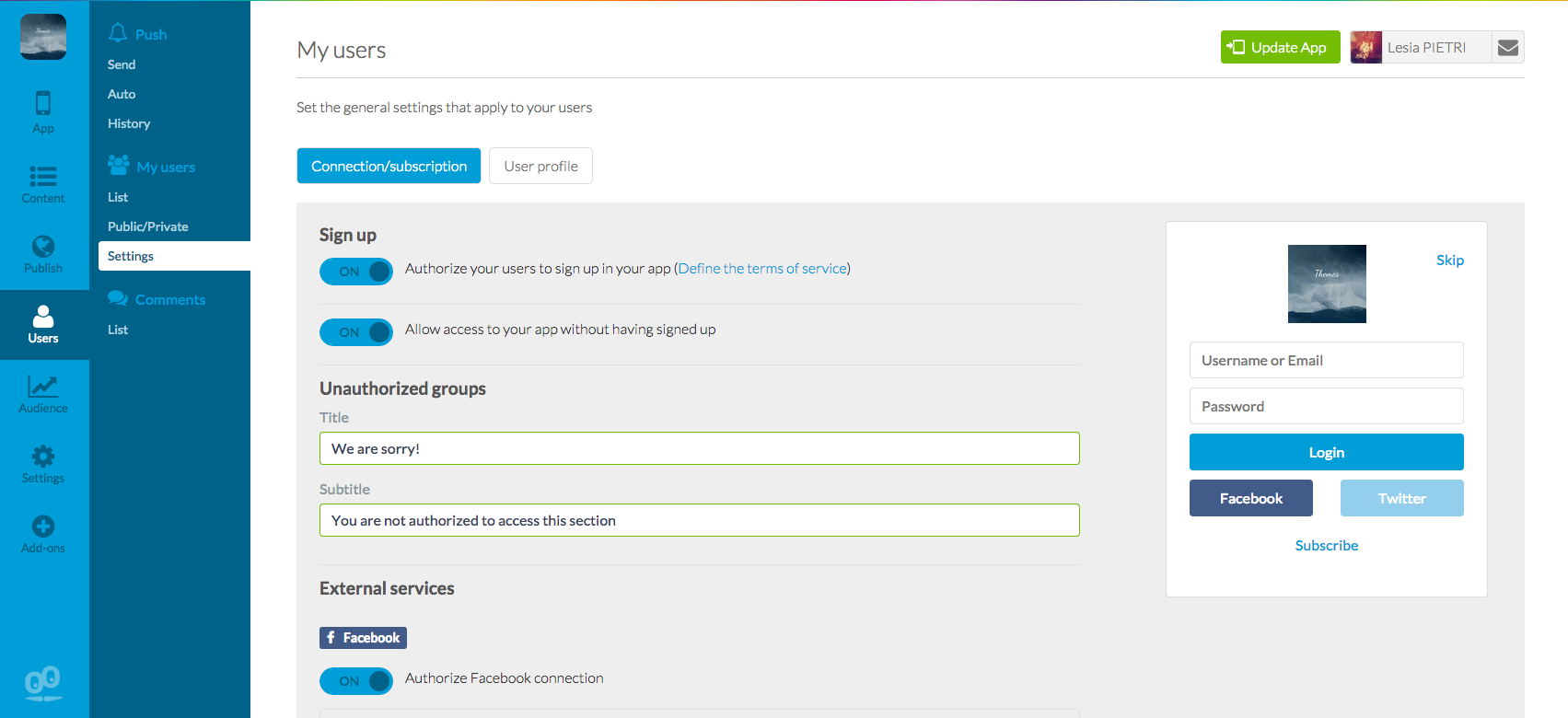 To do so we have to explore the second menu of the "My User" tab, the Public/Private menu. It's here where you can manage the restrictions and authorizations to access your app.