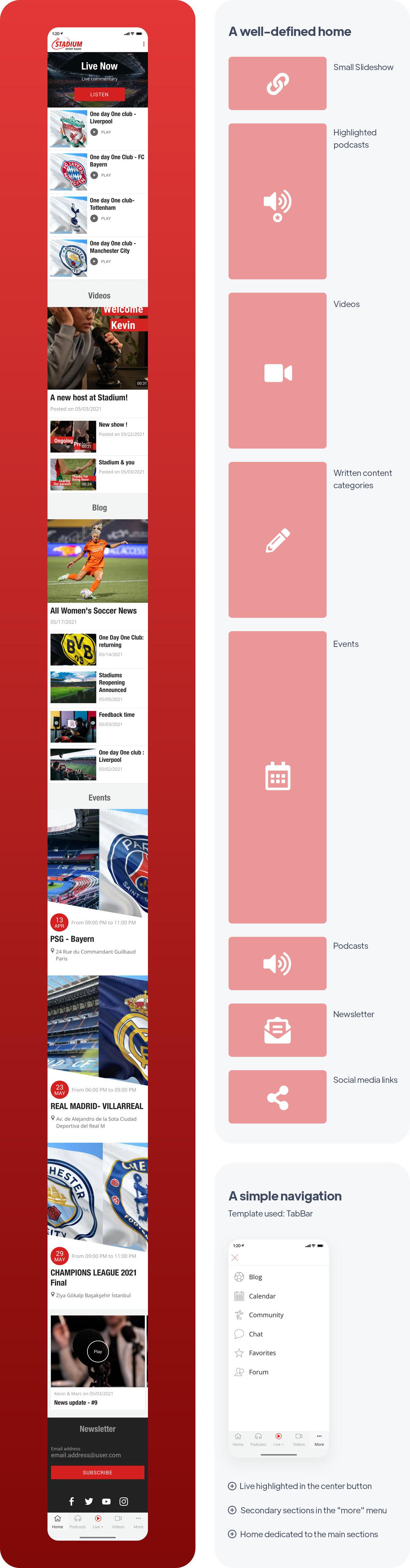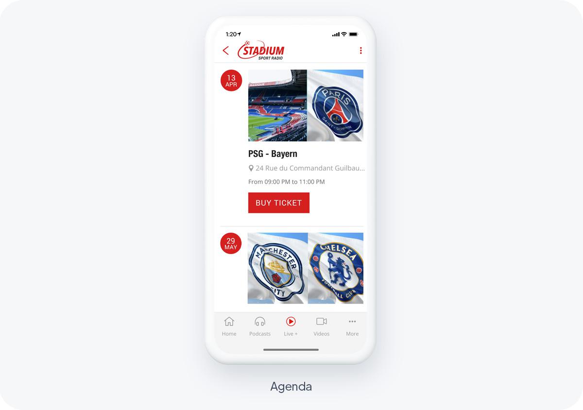 The Stadium radio app serves a radio specialized in sports. It is therefore intended for a well-informed public that comes to look for precise information on a theme that already interests him. Its number 1 objective is to rally around a common passion and to position itself as a reference in this field.