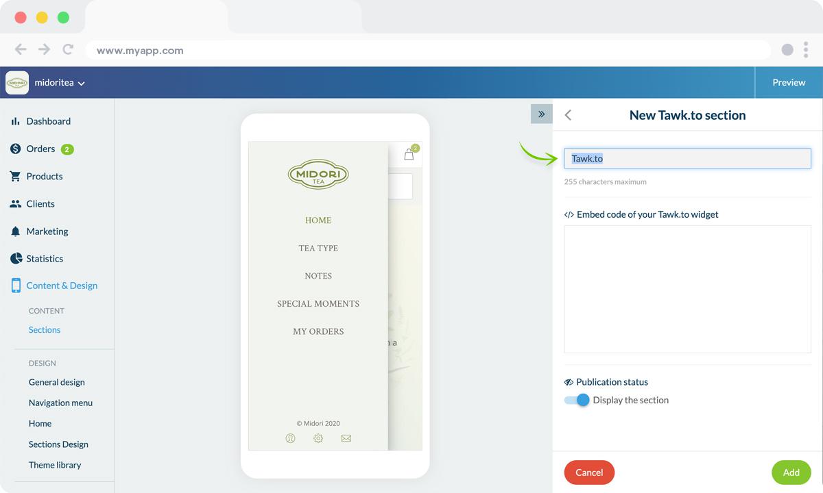 Both these actions will open the section settings panel. Name your section and copy-paste the embed code for the Tawk.to widget.