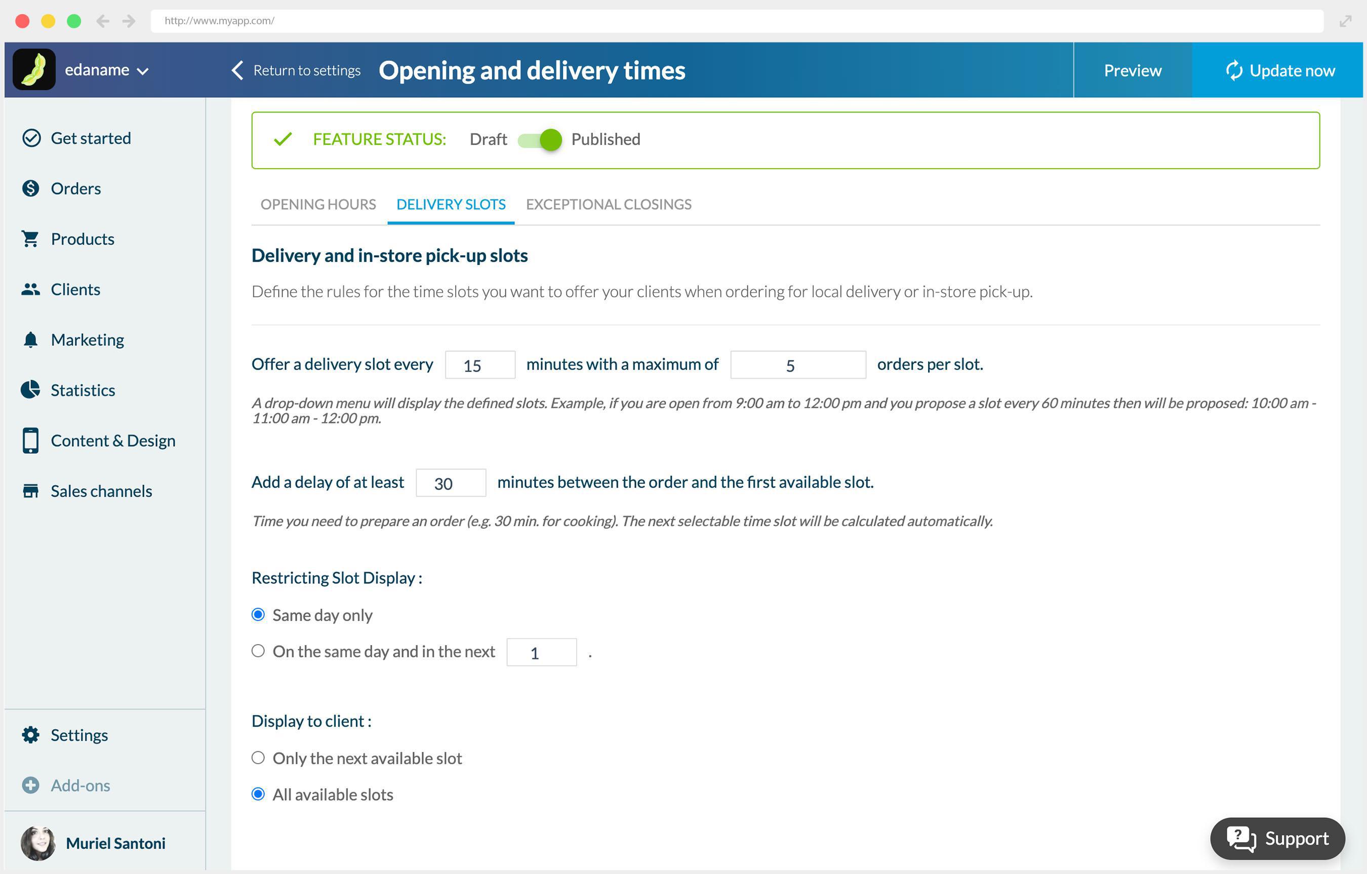 In addition to this, advanced settings allow them to manage preparation time by defining a minimum delay between each pickup and a frequency and number of pickups allowed per day and per time slot.