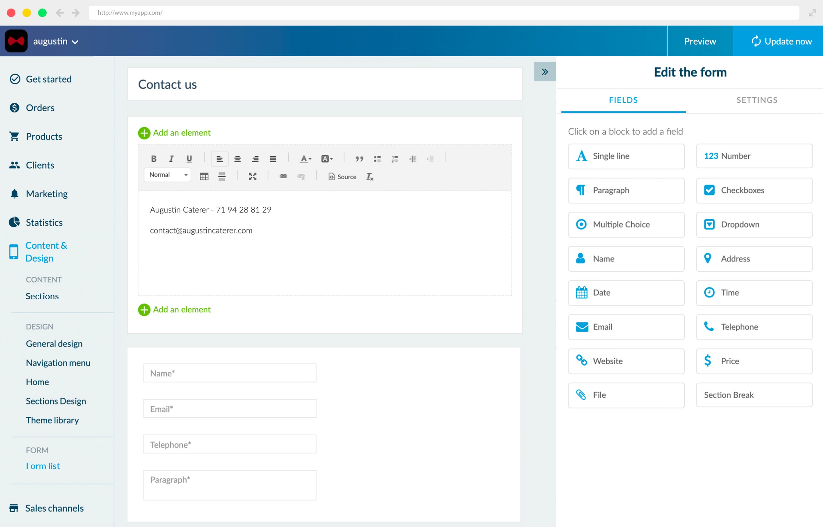 Once the add-on activated, you will be able to customise the design and fields of the form to fit your needs. You can retrieve the form answers by clicking the “display content” button in Content & design > Content > Sections