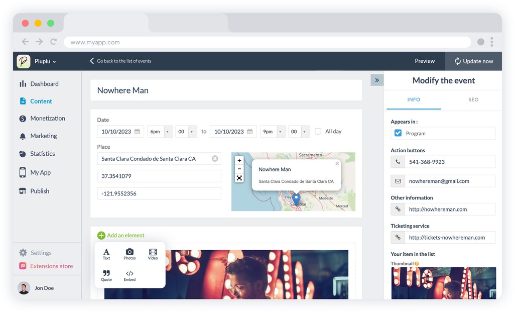 The GoodBarber CMS is very easy to use: you create your events directly from the back office and you share the details of these events with your users. You choose the date, time and address of each event. You can add as much information as you want, in the format that suits you best by adding photos, text or videos to each event.