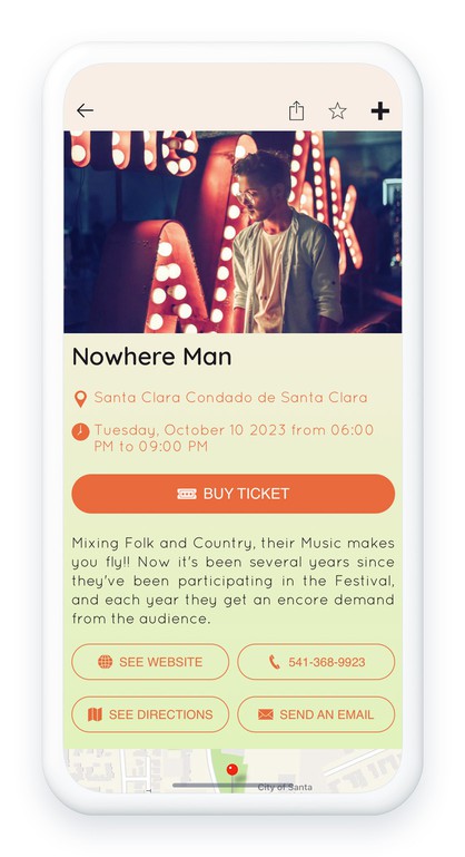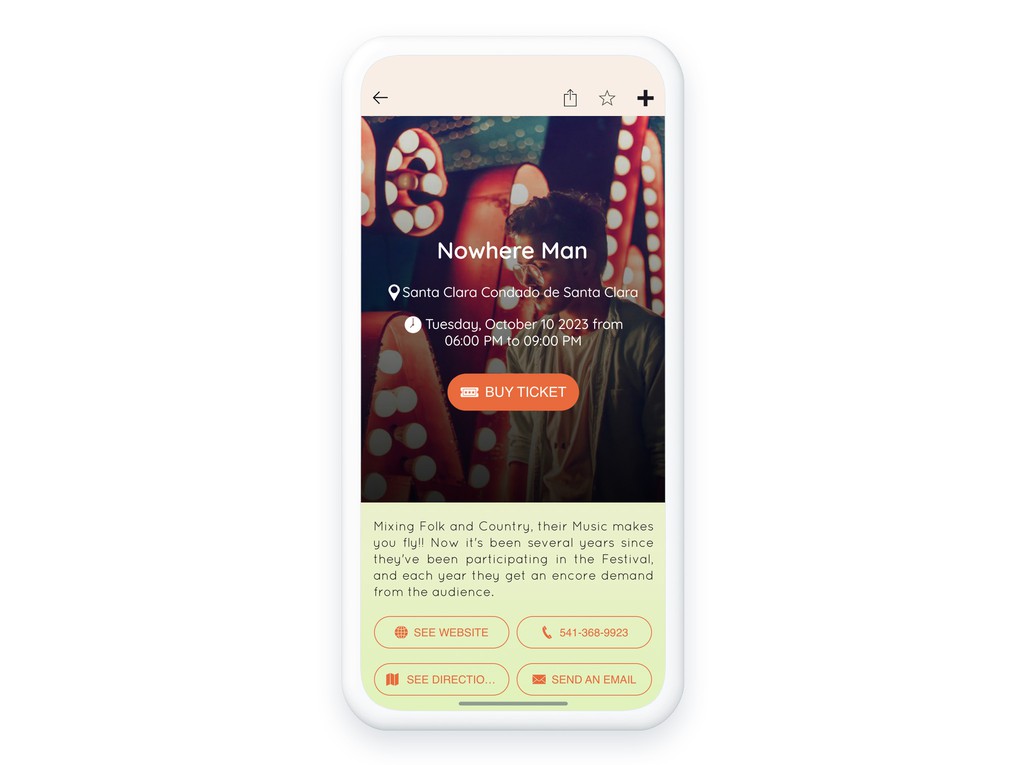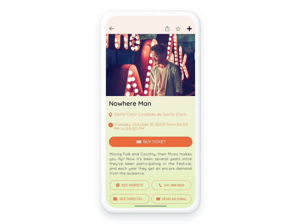 In the right panel of your back office, you can add additional information and actions that will be very useful for your users: phone number, email, ticket purchase link. Fill in your information, GoodBarber will create action buttons that will be displayed in the details page of your event.