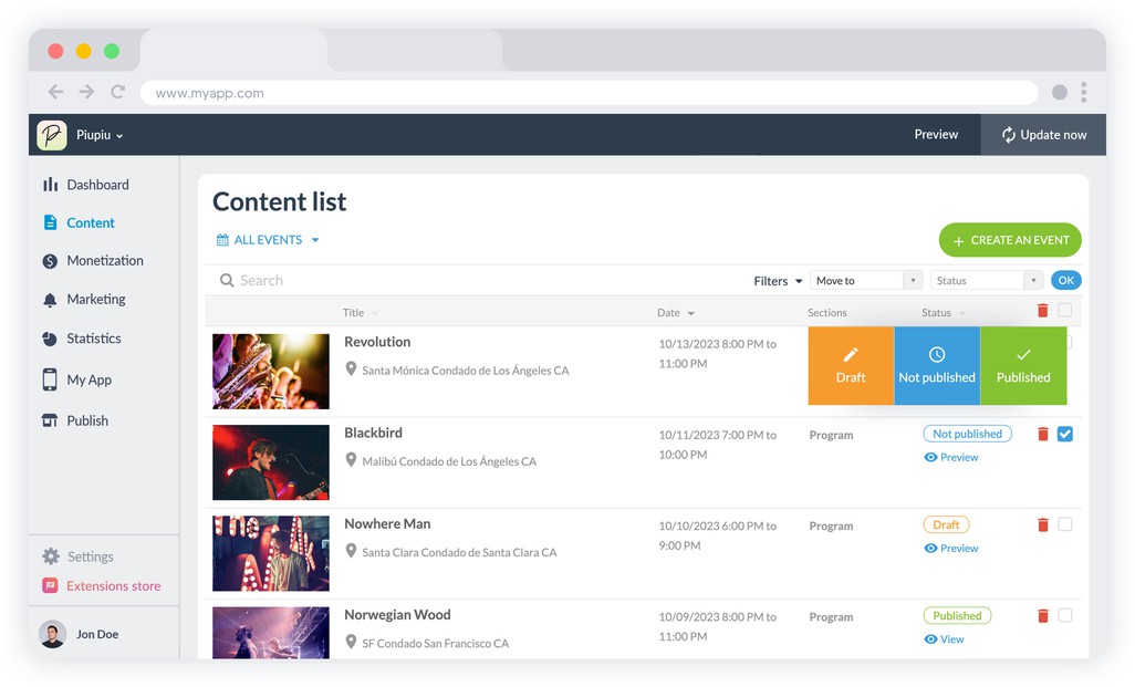 In your GoodBarber back office you have access to a menu dedicated to the management of your contents. You can view all your events and manage them quickly and efficiently. You can move your events between the different sections of your app and manage their publication status individually or in batch.