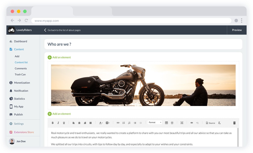 The GoodBarber CMS allows you to create a fully customized About page. You can choose what type of content you want to include: text, photos, videos, quotes or embed code. The possibilities are endless to allow you to present yourself and your message in the best way.