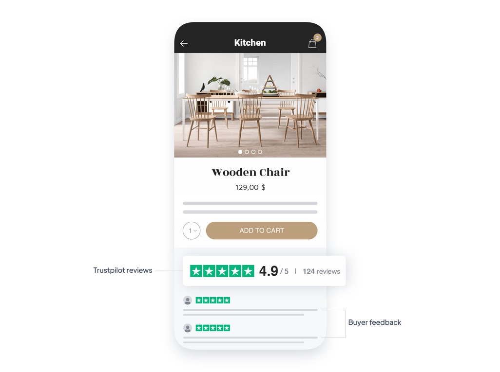 The service of our Service+ team is combined with a specific development to display the reviews in your app. On the product page, the rating calculated by Trustpilot is displayed, as well as each of the reviews submitted by customers.