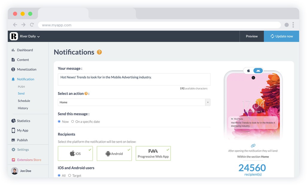 From the dedicated back office page, simply write your message. You define the action that will be triggered when your users open the push notification: open the app, to Home or to a specific section, or open an external link. You can even personalize your notifications by choosing the associated sound, and enabling or disabling badge display on iOS.