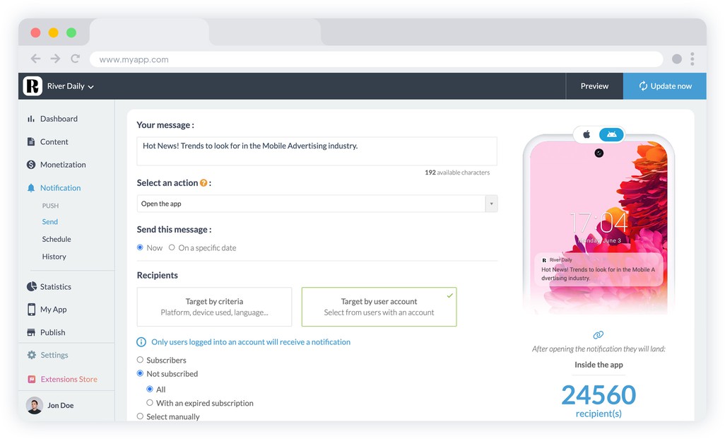 You can also target your users according to the device they use or their geographical location. You can view the number of recipients of your push notification in real time, based on the targeting rules you've defined.