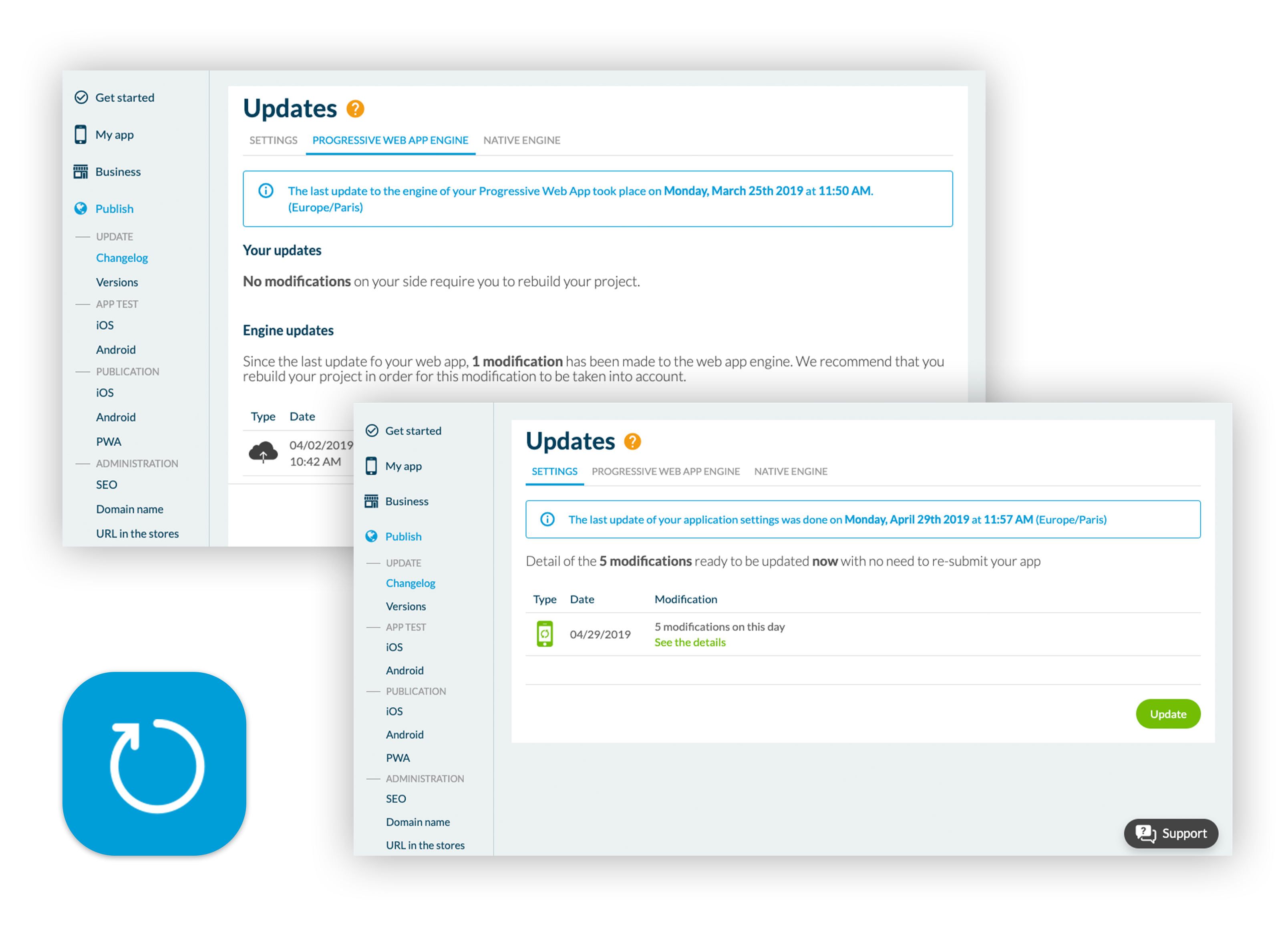 After you’ve shipped your app to the Stores, your app will evolve for sure. You’ll make modifications to it from your backend. You’ll add content, you’ll adjust the design, etc. GoodBarber works in a (magic) way that for 90% of the modifications you make to your app your end users won’t have to download a new version of the binary file. They will get the latest modifications of your app automatically.