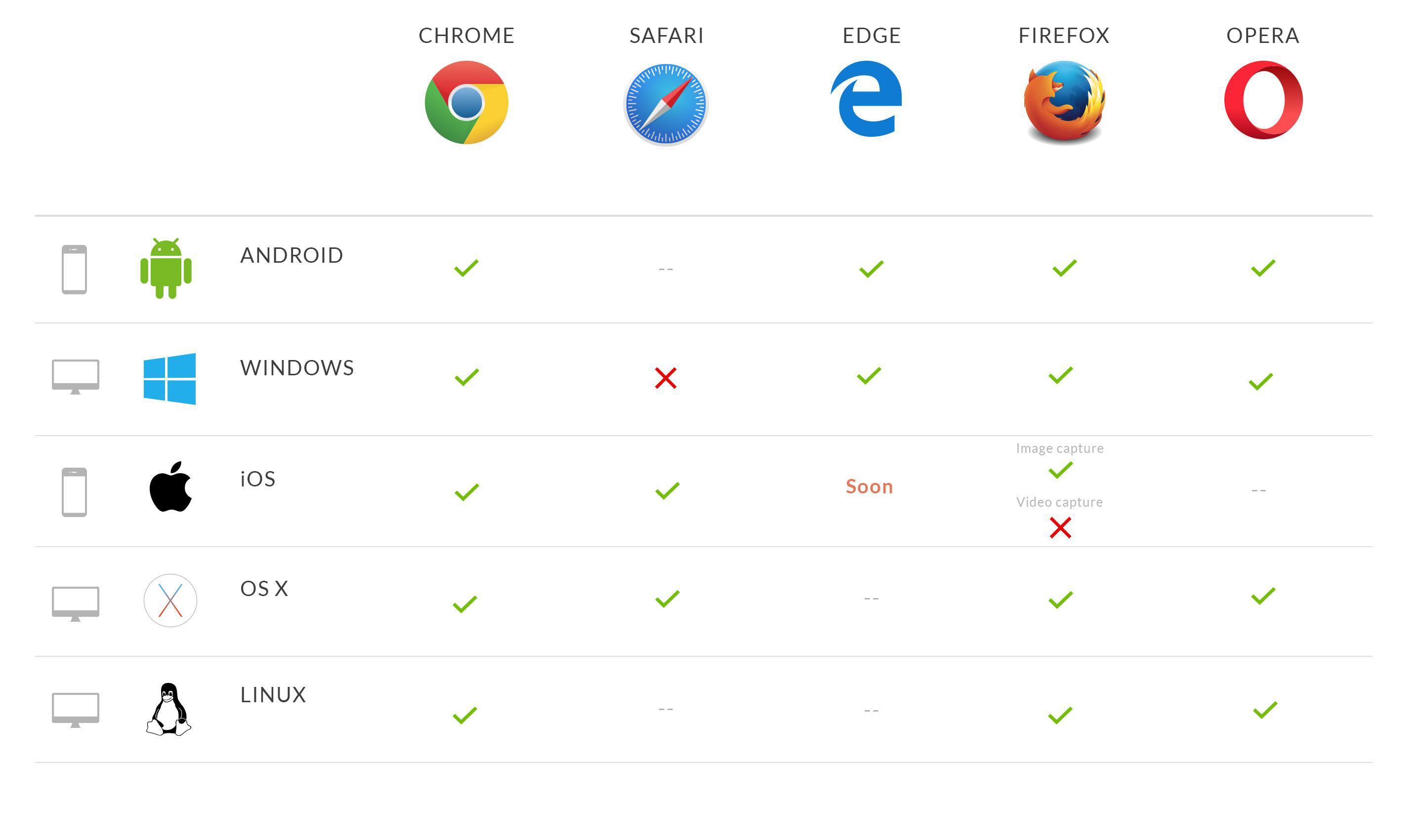 Today, the "Media Capture API" gives web apps direct access to audio and video feeds (aka the camera and microphone). This feed is readable and can be handled from the application. It is therefore possible to take a photo or record a video without leaving the browser.