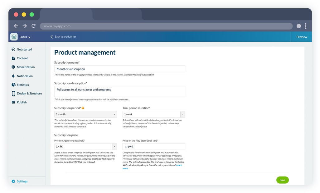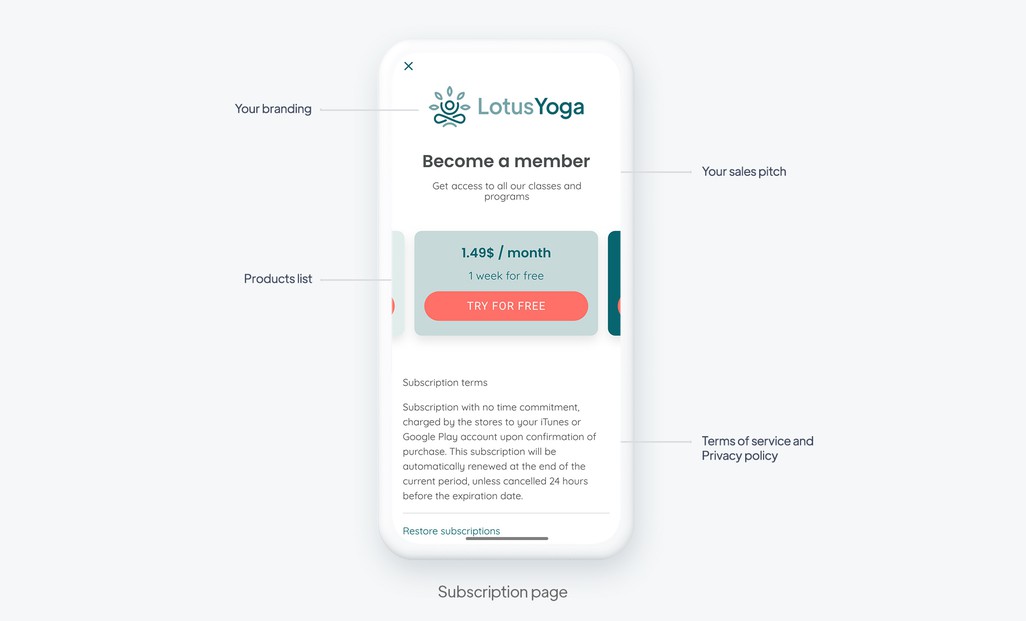 Although this comes at a cost (15% of revenue is taken from sales), the Apple and Google stores take care of everything: they handle the entire payment workflow, automatic subscription renewal and transaction.