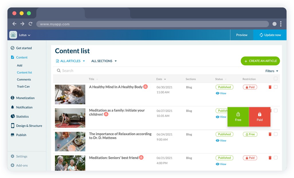 With the Preview option, offer non-subscribing users a preview of your app's paid content. Choose the number of paragraphs you want to reveal to make users want to become a member of your app.
