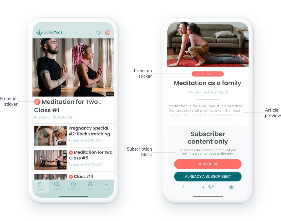 The Premium Sticker is also a very effective marketing tool. It allows you to indicate to the user which exclusive content is accessible by subscribing. The sticker is also customizable to be in accordance with your graphic guidelines.