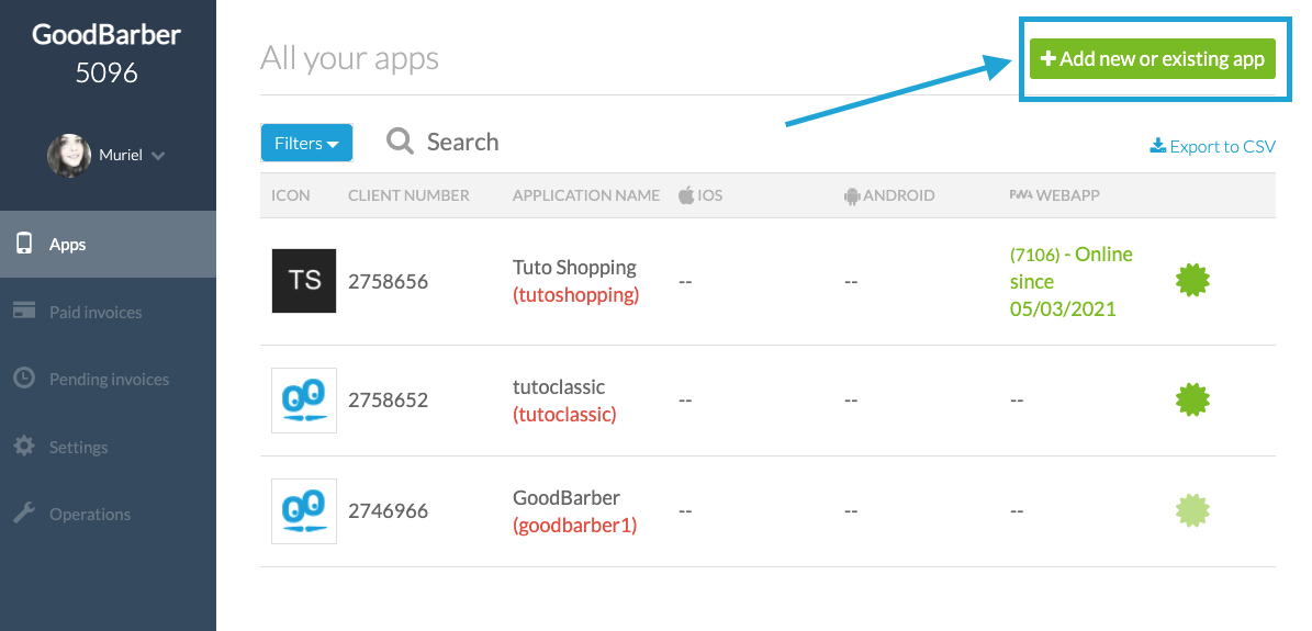 To create new projects (apps), it's very simple. Log in your Dashboard and click on the "Add new or existing app" button located on the top right of the dashboard.