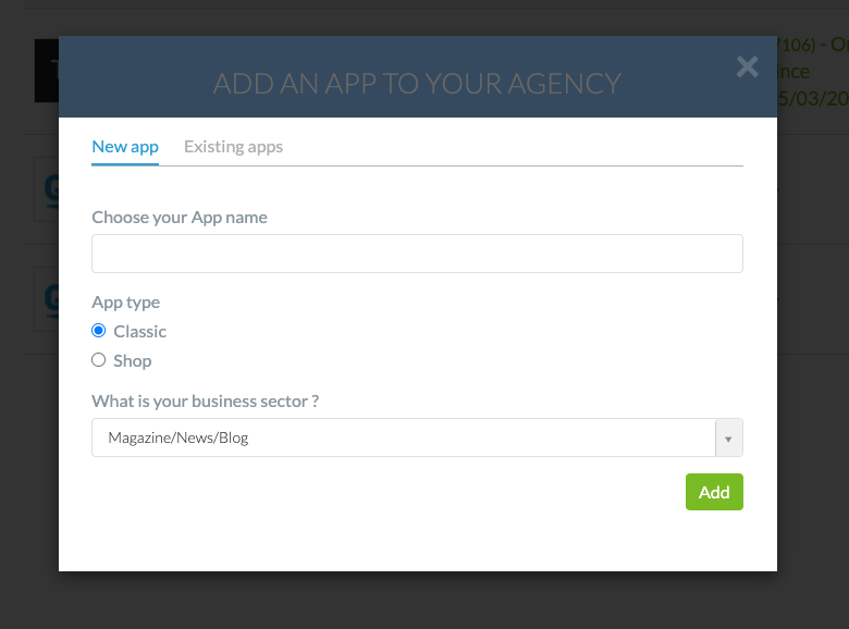 Then choose the name of your project, the type (Classic or Shopping), the category of the app and validate. Don't forget, with a Reseller subscription, you can create as many apps as you want. Your new app is now created and can be found in the list of apps on your Dashboard.