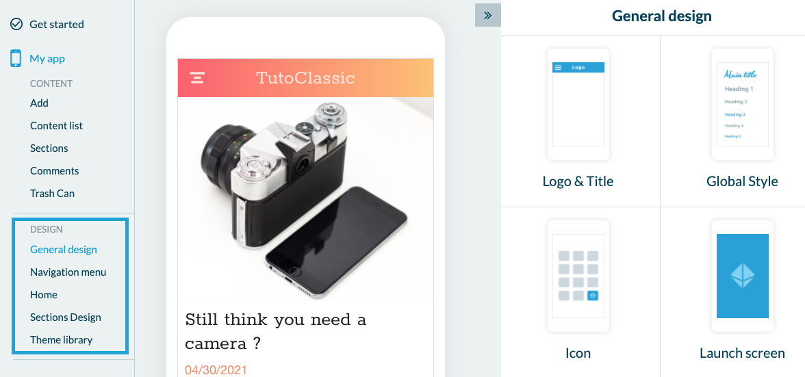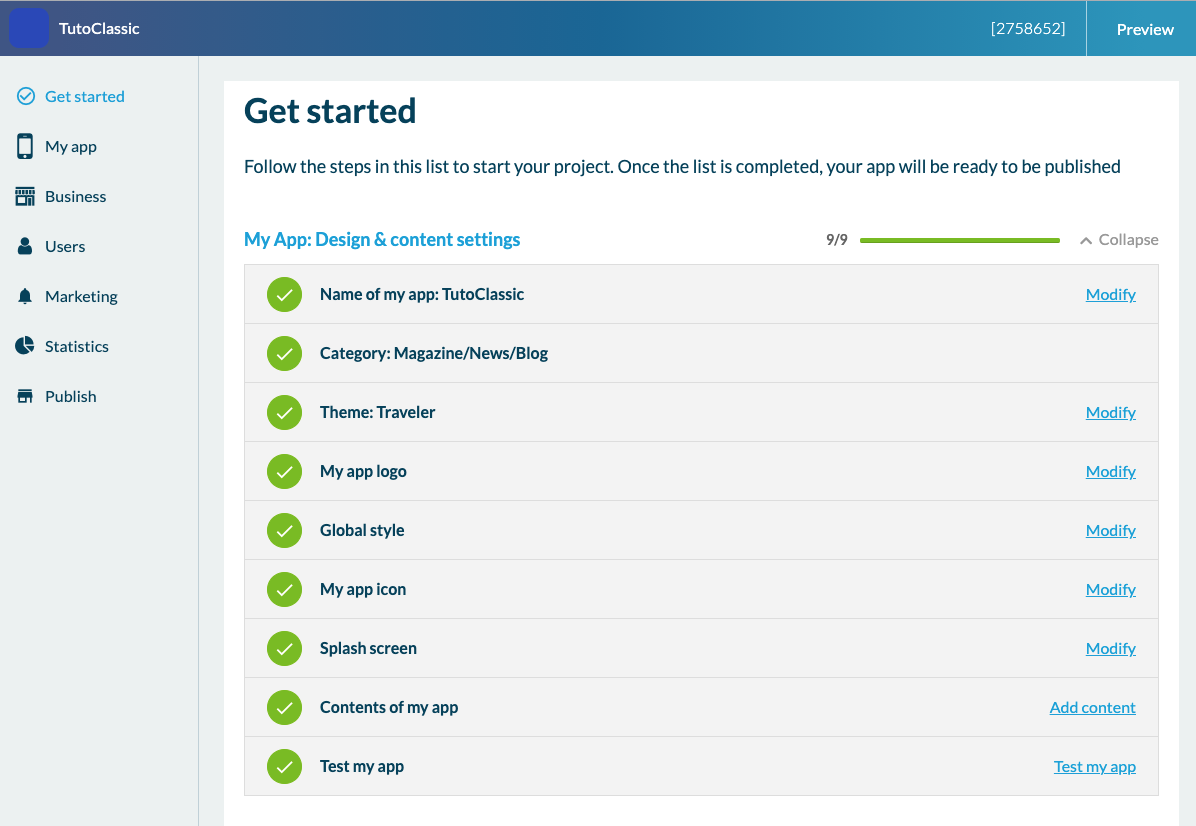 Now that you know how to create an app from your Dashboard, we'll show you how a Classic App works. From the Dashboard, by clicking on the name of the project, you'll land in the back-office of the app, which is the only interface on which you will build your first app. When you get to the back office you will see the Get Started menu which will allow you to follow the app's creation progress.