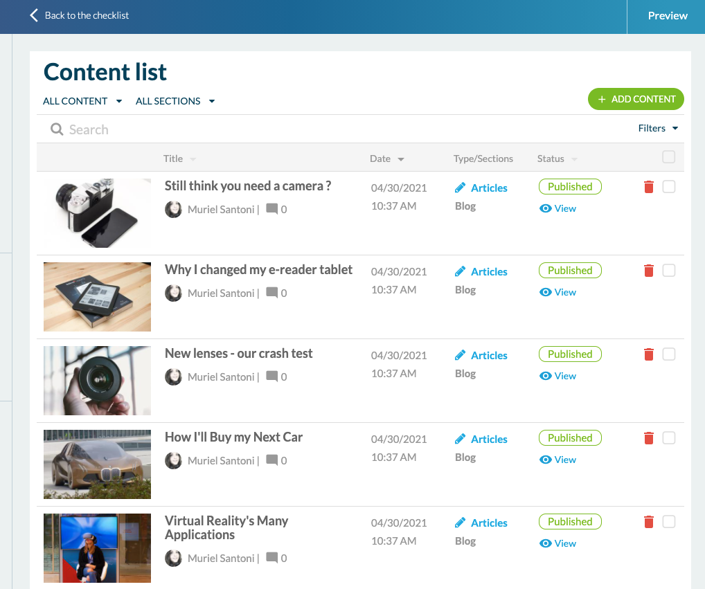 To start, go to "My App" > "Content". This is where you can add content of any type. In "Content list" you can view and organize all the content present in the app.
