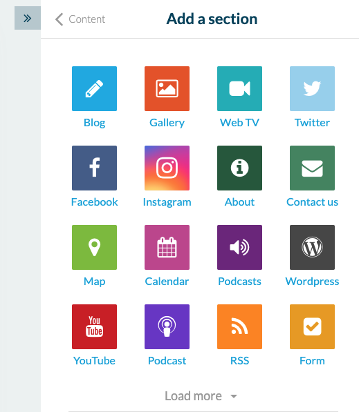 Then in the "Sections" menu, you'll be able to add all the sections available in the app, such as a calendar, a map, a form or an HTML container. These sections will be found in the navigation menu.