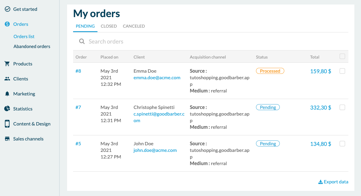Let's start with the "Orders" menu where all the orders of the final clients are managed. There are 4 order statuses. "Pending" and "Processed" are listed under the "Open" tab. Then the "Delivered" status switches the order to the "Closed" tab. As soon as an order is placed in "closed" it's counted in the sales statistics. Finally, the status "cancelled" allows you to list cancelled orders. If you enter the details of an order, you'll see all the information useful for the processing of this order such as the items ordered, the type of payment, the client's address or the acquisition channel.