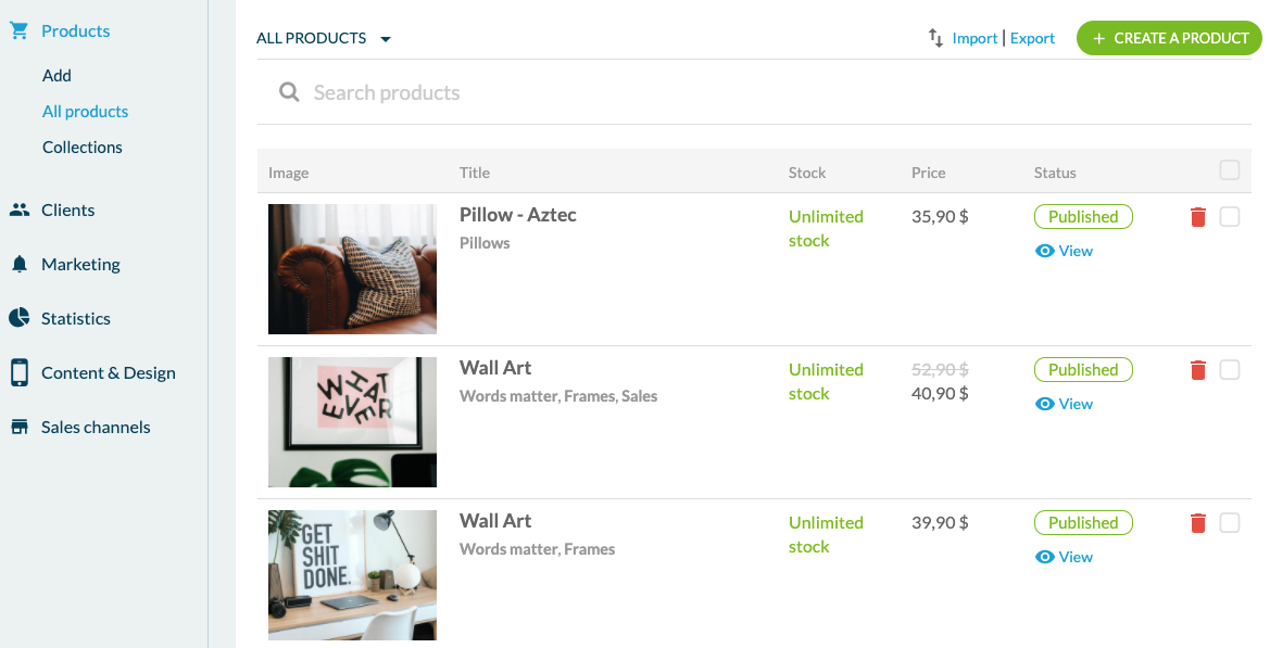 Then in "Products", you can of course add a product . Here you can configure the title and subtitle of the product, add up to 9 photos, text, and variants. You'll also have the possibility to add a crossed-out price, the stock status, and add a reference. Variants are useful to list different sizes, colors, or packaging. For example, if you build an app selling T-Shirts you'll be able to list all sizes and different colors of the T-shirt. No need to create 1 product per color for example. Once the product is created, you'll find it in "all products". Here you'll see all your products and you can arrange them in different collections. Speaking of collections, the following menu allows you to create and configure collections. Collections are groups of products that you'll use to organize the navigation menu and the Home Page.