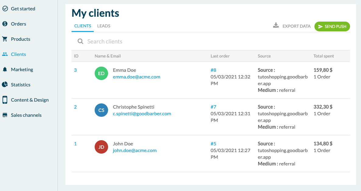 Continuing in the menu, you'll see the client management options. Here you'll first find the list of clients in the app. These are people who have registered and placed at least one order in the app. The client record includes all useful information such as contact details, order history, or total amount spent. The " Leads " tab lists the people who have registered to the app but have never purchased anything.