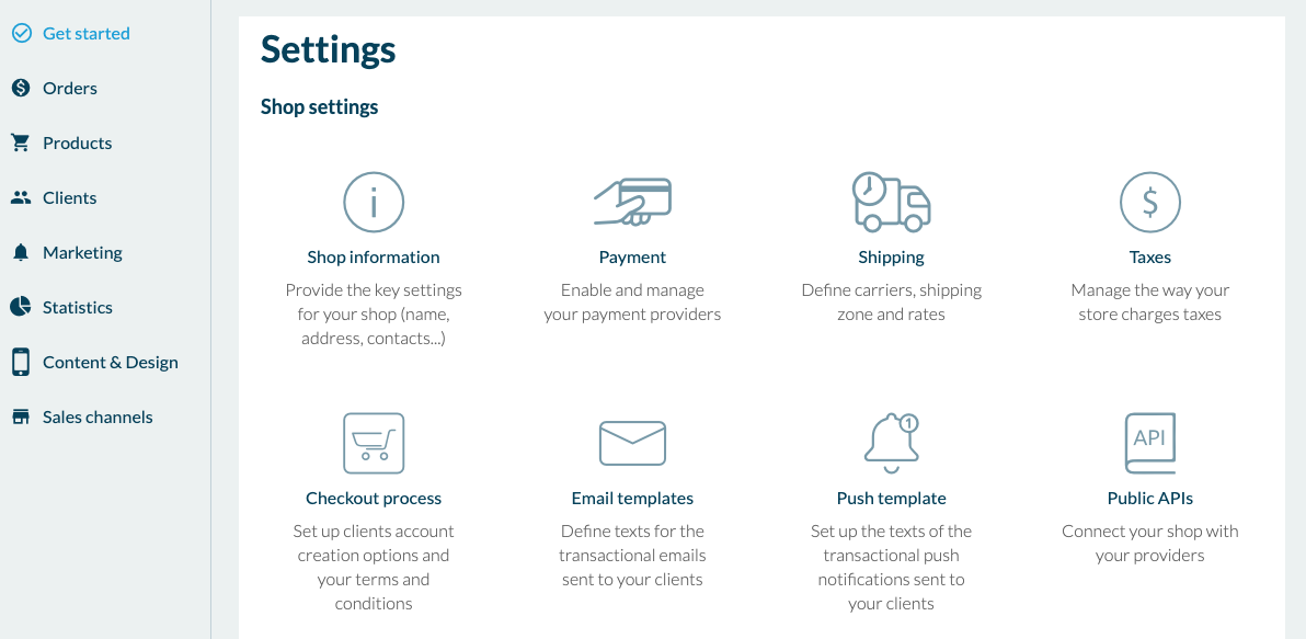 To create a Shopping app, you have to follow the same process as for the Classic app from the Dashboard, but choosing "Shopping" of course. The Get started menu works like on the Classic.