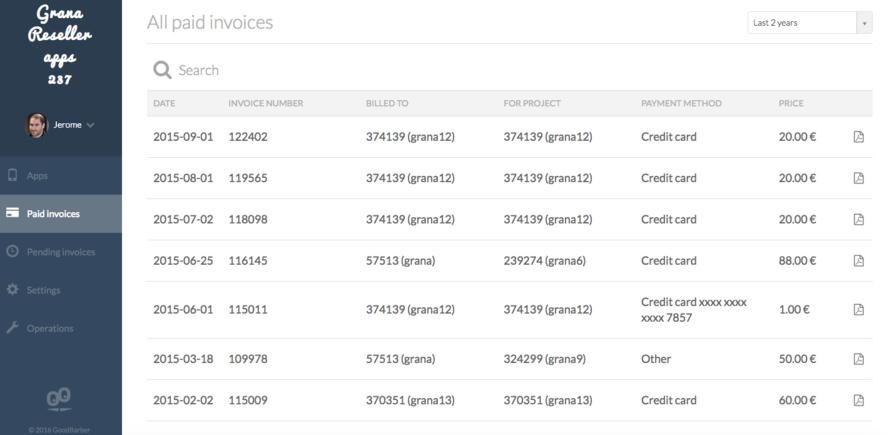 All paid and pending invoices can be seen in this interface. The identification number seen next to each purchase allows you to keep track of which projects you bought what for, since all payments are made only from one backend—the alpha project.