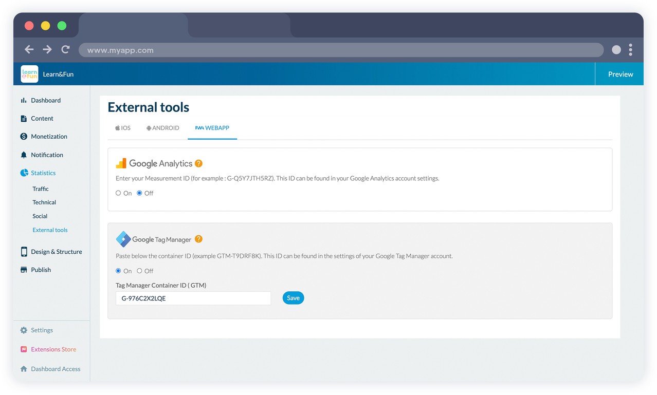 Connect your Google Tag Manager account to your PWA. The Google Tag Manager integration is automatically configured with the relevant events of your app, allowing you to get detailed usage statistics. Thanks to the Google Tag Manager extension, the behavior of your app's users will no longer hold any secrets for you.