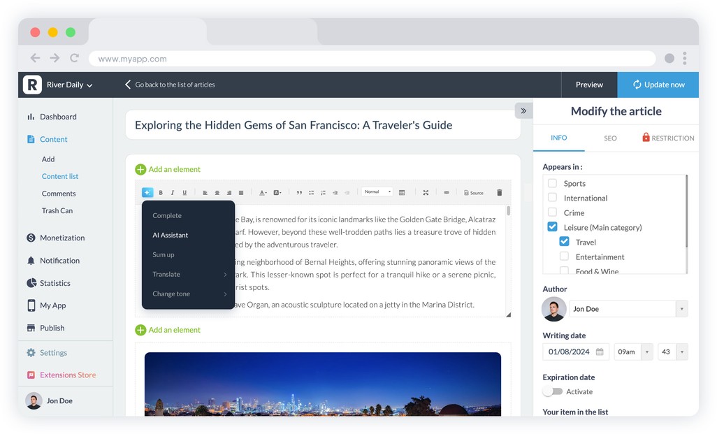 GoodBarber's AI Assistant, powered by OpenAI technology, is designed to revolutionize the way you create content in the CMS.