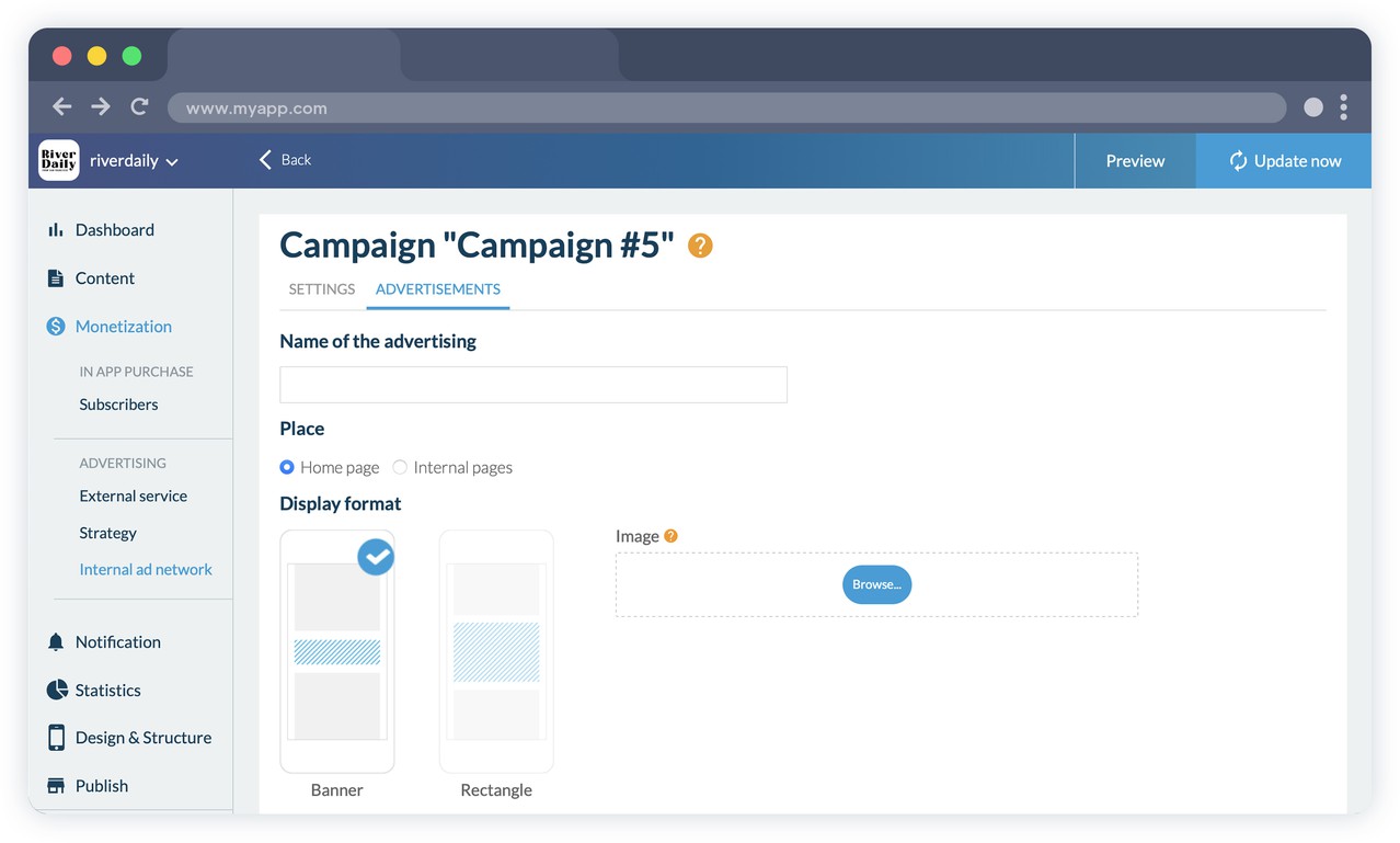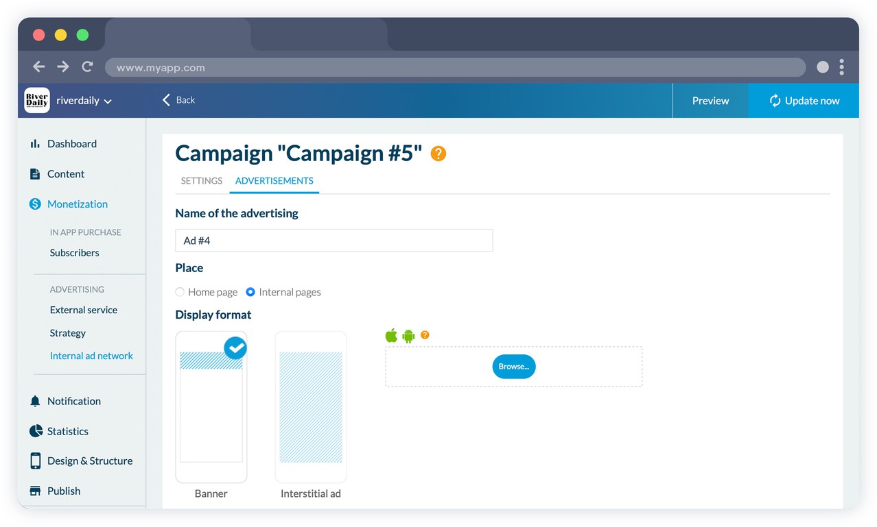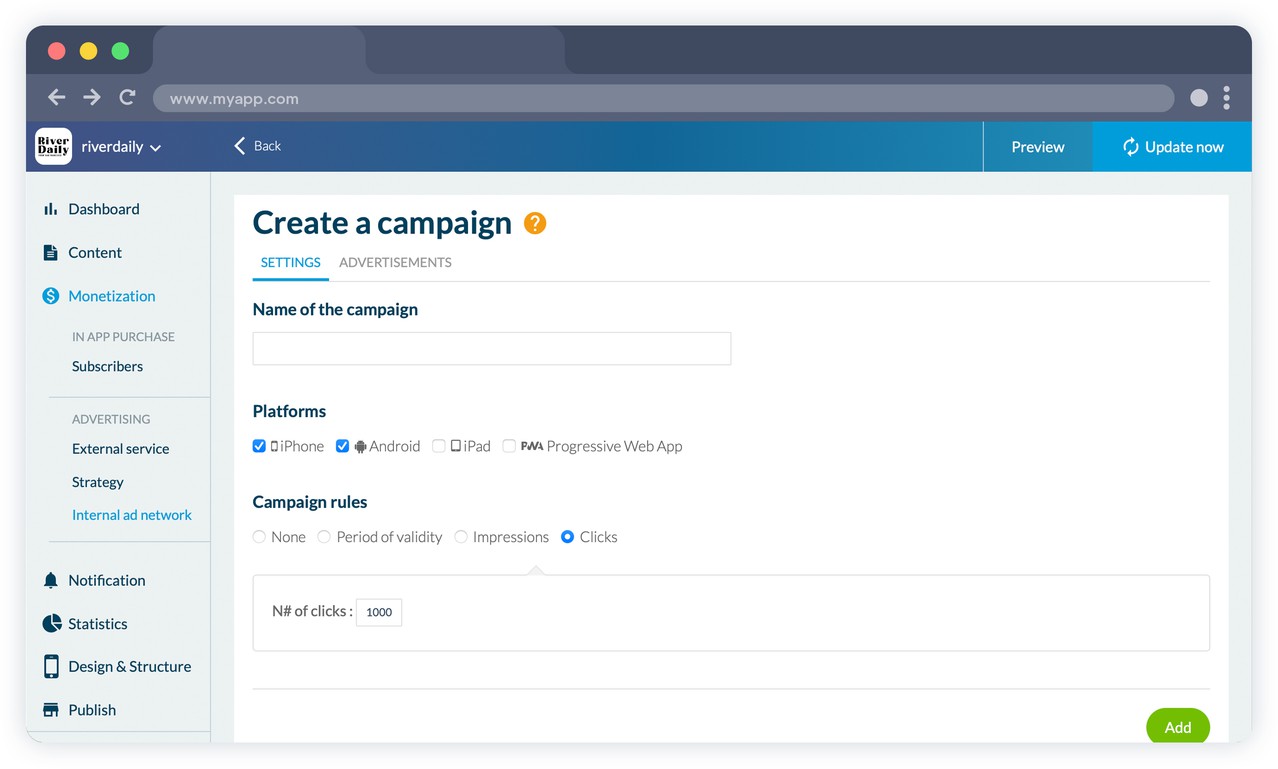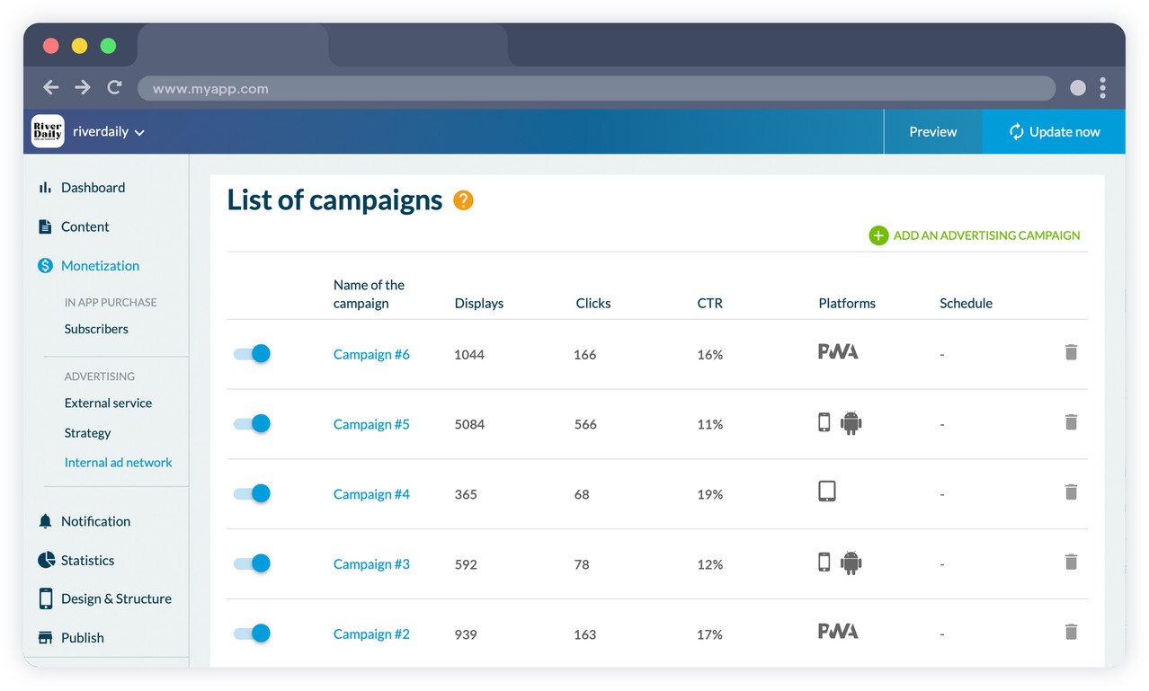 Manage your splash screens and banner ads. Create your campaigns by selecting your criteria: for each campaign, set ad display constraints: number of impressions, number of clicks, time period. Ads in a campaign are automatically rotated. Select one or more platforms for your campaigns: iOS and/or Android.