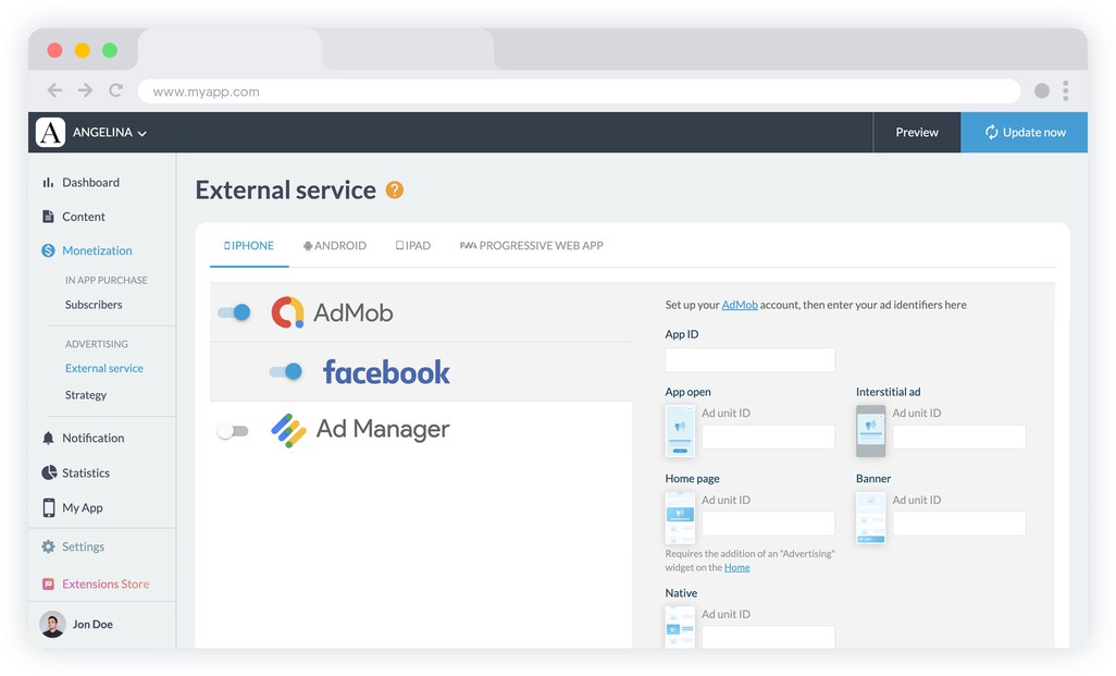 Connect your Google AdMob account to your app and sell your ad placements to millions of advertisers.